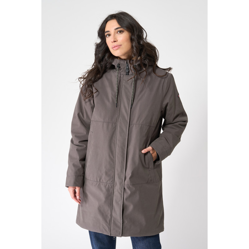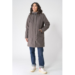 Abrigo de mujer 100% impermeable con capucha y forro interior de borreguito. Cierre frontal con cremallera de doble cursor, que se oculta con una tapeta cerrada con corchetes.