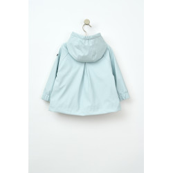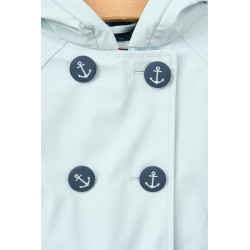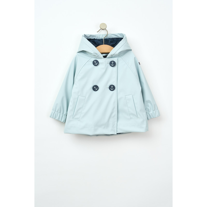 Chubasquero o impermeable de bebe fabricado en poliuretano con forro interior de pelo. Modelo con forma acampanada y pliegue en la espalda. Tiene cierre de cremallera oculta con cuatro botones en el pecho con motivos de anclas. Bajo elástico en las mangas y dos bolsillos ribeteados en el frente.