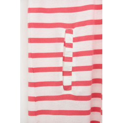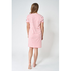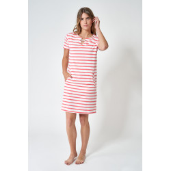 Vestido navy 100% de algodón de 180 gramos. Lleva un detalle de una cinta que une los dos extremos del escote, bolsillos laterales y un corte normal que la convierten en una prenda cómoda y fácil de llevar.